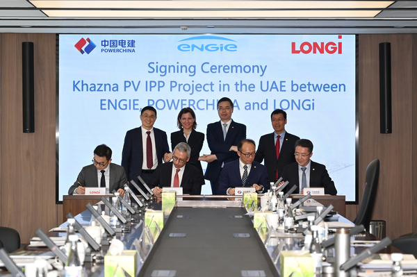 会上,中国电建与Engie集团、隆基绿能举行了阿联酋阿布扎比PV4哈兹纳1500兆瓦光伏项目合作协议签约仪式。