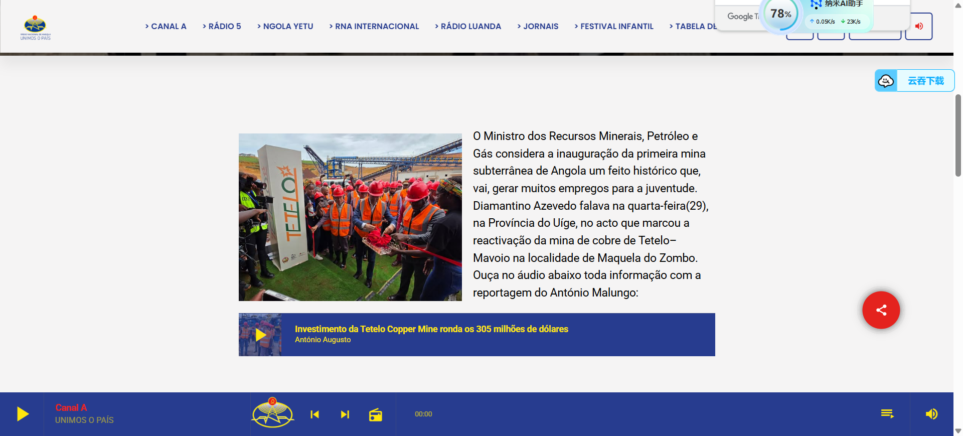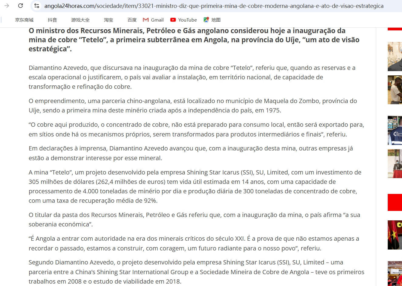 日前,由水(shui)电十(shi)四(si)局承(cheng)建的安哥拉(la)Tetelo铜矿投产(chan),铜矿露(lu)天开采工作正(zheng)式(shi)启(qi)动,安哥拉(la)主流(liu)媒(mei)体争相进行报道。 《安(an)(an)哥(ge)拉(la)(la)国家广播(bo)电台》《安(an)(an)哥(ge)拉(la)(la)日报》《安(an)(an)哥(ge)拉(la)(la)24小时报》等(deng)多家当地(di)主(zhu)流(liu)媒体纷纷从(cong)经(jing)济(ji)价值、社会贡献、合作意义等(deng)方面,多维度点(dian)赞这一里程碑(bei)事件。 安(an)(an)哥拉国家(jia)广(guang)播电台报道:“安(an)(an)哥拉矿(kuang)(kuang)业(ye)迎来历(li)史性(xing)(xing)时刻:Tetelo铜(tong)矿(kuang)(kuang)一期投产,时隔半世(shi)纪重启露天铜(tong)矿(kuang)(kuang)开(kai)采。今日对安(an)(an)哥拉矿(kuang)(kuang)业(ye)而言(yan)具(ju)有历(li)史性(xing)(xing)意义。时隔50年后(hou),安(an)(an)哥拉在威热省马(ma)克拉杜(du)宗博市马(ma)沃(wo)约地区正式启动(dong)Tetelo铜(tong)矿(kuang)(kuang)一期项目投产,重新开(kai)启露天铜(tong)矿(kuang)(kuang)开(kai)采事业(ye)。” 《安哥拉日报》报道(dao):“位(wei)于(yu)威(wei)热省马(ma)克(ke)拉杜宗博(bo)市的(de)Tetelo铜(tong)矿今日正(zheng)式投(tou)产,标志着该地(di)(di)区(qu)铜(tong)矿露天(tian)开采工作的(de)启动。项目成(cheng)果(guo)显著,为当地(di)(di)青年(nian)创造了更多就业岗位(wei),为地(di)(di)方经济(ji)发展(zhan)作出更大贡(gong)献。” 《安(an)哥拉(la)24h报(bao)》报(bao)道(dao):“安(an)哥拉(la)首座(zuo)地下铜矿‘Tetelo’投产(chan),中(zhong)安(an)合(he)作开(kai)启(qi)新纪元(yuan)。安(an)哥拉(la)矿产(chan)资源、石油与天然气部长今(jin)日称(cheng),位于威热(re)省的(de)(de)安(an)哥拉(la)首座(zuo)地下铜矿Tetelo投产(chan),是(shi)‘一项具(ju)有战略远见的(de)(de)举(ju)措’。” 多(duo)(duo)家主(zhu)流(liu)媒体在报道中(zhong)强调(diao),中(zhong)安(an)合作开启(qi)新纪元,Tetelo铜矿投产对安(an)哥拉(la)而(er)言具(ju)有(you)历史(shi)性意(yi)义,是巩固国民经济、实现收入来源多(duo)(duo)元化的(de)重要一步(bu),对安(an)哥拉(la)工(gong)业与技术发(fa)展(zhan)具(ju)有(you)重要象征意(yi)义。同时,Tetelo铜矿为(wei)当地创造多(duo)(duo)个就业岗位(wei)、为(wei)地方(fang)经济发(fa)展(zhan)作出(chu)更大贡献。安(an)哥拉(la)政府官员指出(chu)“这(zhei)意(yi)味(wei)着价值将(jiang)在本土创造,就业将(jiang)在本土提供,财富(fu)将(jiang)留存(cun)于安(an)哥拉(la)。” Tetelo铜矿的成功投产,是水电十(shi)四(si)局(ju)践(jian)行“一(yi)(yi)带一(yi)(yi)路”倡议(yi)、深化国际产能合(he)作的又一(yi)(yi)重要(yao)成果。水电十(shi)四(si)局(ju)将以卓越的工程(cheng)实(shi)力和(he)负责任(ren)的企(qi)业(ye)形象,不断开拓海外市场,在全(quan)球市场深化合(he)作,为推动高质量(liang)(liang)共建“一(yi)(yi)带一(yi)(yi)路”行稳致远贡献更多电建力量(liang)(liang)。 安哥拉广播电台 安哥拉日报 安哥拉24h报 安哥拉财经扩展报 |