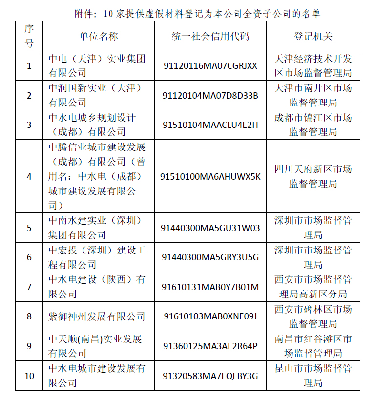 中国水利水电建设集团有限公司(以下简称“本公司”)为中国电力建设集团有限公司的全资子公司,法定代表人季晓勇,成立日期为1989年1月3日。在未经本公司许可同意的情况下,先后有10家国内企业擅自将本公司登记为全资股东,他们分别是中电(天津)实业集团有限公司、中水电城乡规划设计(成都)有限公司、紫御神州发展有限公司、中天顺(南昌)实业发展有限公司、中南水建实业(深圳)集团有限公司、中润国新实业(天津)有限公司、中腾信业城市建设发展(成都)有限公司[曾用名:中水电(成都)城市建设发展有限公司]、中宏投(深圳)建设工程有限公司、中水电建设(陕西)有限公司、中水电城市建设发展有限公司(以下统称“假冒企业(ye)”)。 本(ben)公(gong)司从未批准设(she)立、收购、出资注(zhu)册(ce)上述假(jia)冒企(qi)(qi)业,假(jia)冒企(qi)(qi)业进行登记(ji)注(zhu)册(ce)所(suo)使用的(de)涉及本(ben)公(gong)司的(de)包(bao)括:股(gu)(gu)东(dong)决(jue)议、股(gu)(gu)权转让(rang)协议、本(ben)公(gong)司营(ying)业执照(zhao)、公(gong)司印章和法定(ding)代表人(ren)签(qian)名在内的(de)所(suo)有(you)登记(ji)材料均系伪(wei)造(zao)。 就(jiu)上(shang)述(shu)事(shi)宜,本公司郑重声明如下: 1.本公司从未出(chu)资设立上述假(jia)冒(mao)企业,我公司与以上10家假(jia)冒(mao)企业不存在任何股权(quan)关系,也不存在任何形(xing)式的出(chu)资、隶属、关联(lian)或实际(ji)控制关系。 2.本公司已(yi)分别向10家假冒(mao)企业的注(zhu)册登记机关进行举(ju)报,现10家假冒(mao)企业均已(yi)被(bei)注(zhu)销或(huo)撤(che)销。 3.假(jia)冒企业以本公司(si)名义提供虚假(jia)材料进行(xing)公司(si)登(deng)记,本公司(si)对此并不知情也从(cong)未(wei)同意或授(shou)权(quan),假(jia)冒企业及其各(ge)级下设公司(si)所进行(xing)的一切行(xing)为均(jun)与本公司(si)无关,请社会各(ge)界提高警惕。 4.本公(gong)(gong)司严正警(jing)告相关不法(fa)(fa)人员,立(li)即停止(zhi)以本公(gong)(gong)司子企业名义对外开展经营活(huo)动。否则本公(gong)(gong)司将通过法(fa)(fa)律途径严肃(su)追究相关不法(fa)(fa)人员责(ze)任,包括(kuo)但不限于刑事、行政、民事法(fa)(fa)律责(ze)任,以维护本公(gong)(gong)司合法(fa)(fa)权益。 5.本(ben)公司提醒(xing)投(tou)资(zi)者(zhe)、企(qi)事业单(dan)位、社会公众,慎重与上述假冒企(qi)业及其关联公司开展业务合(he)作,切实防范(fan)风险(xian)。 特此声明。