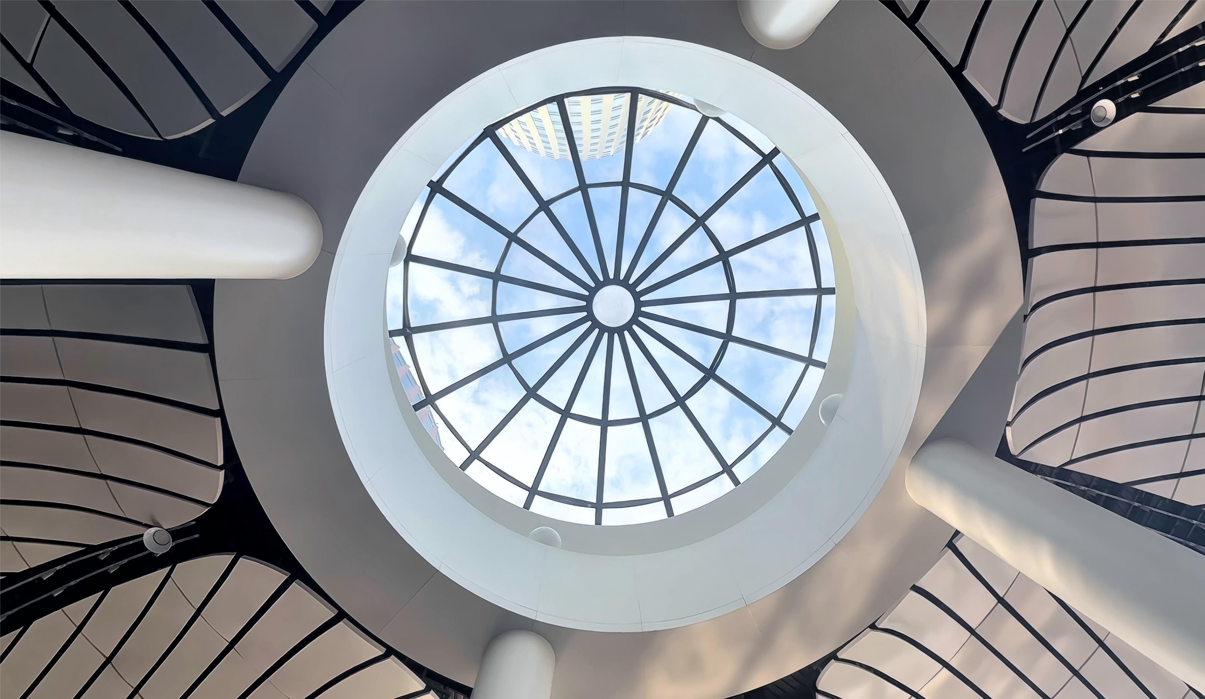 团队精益求精的探索,将建筑中蕴含的中式美学尽数展现。雨时,可见“微风忽吹莲叶起,青玉盘中泻水银”的画卷铺展。晴日,于厅内望向“荷心”玻璃圆顶,澄澈天空与鲜亮幕墙相映成趣。