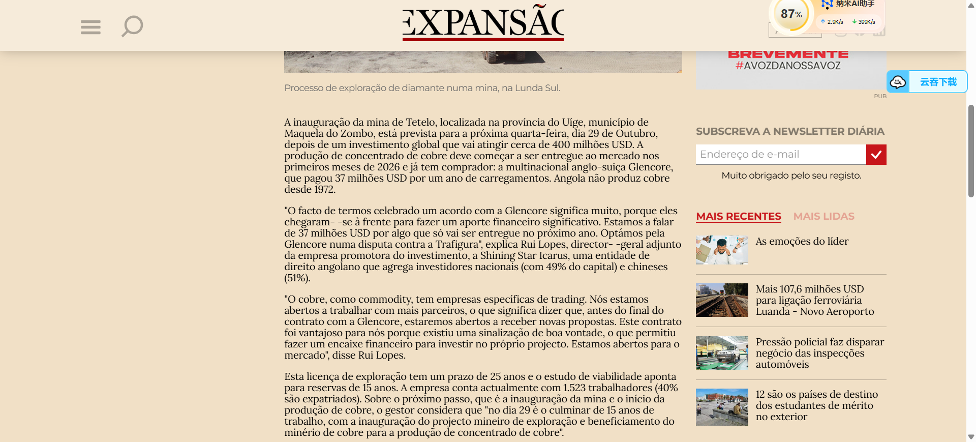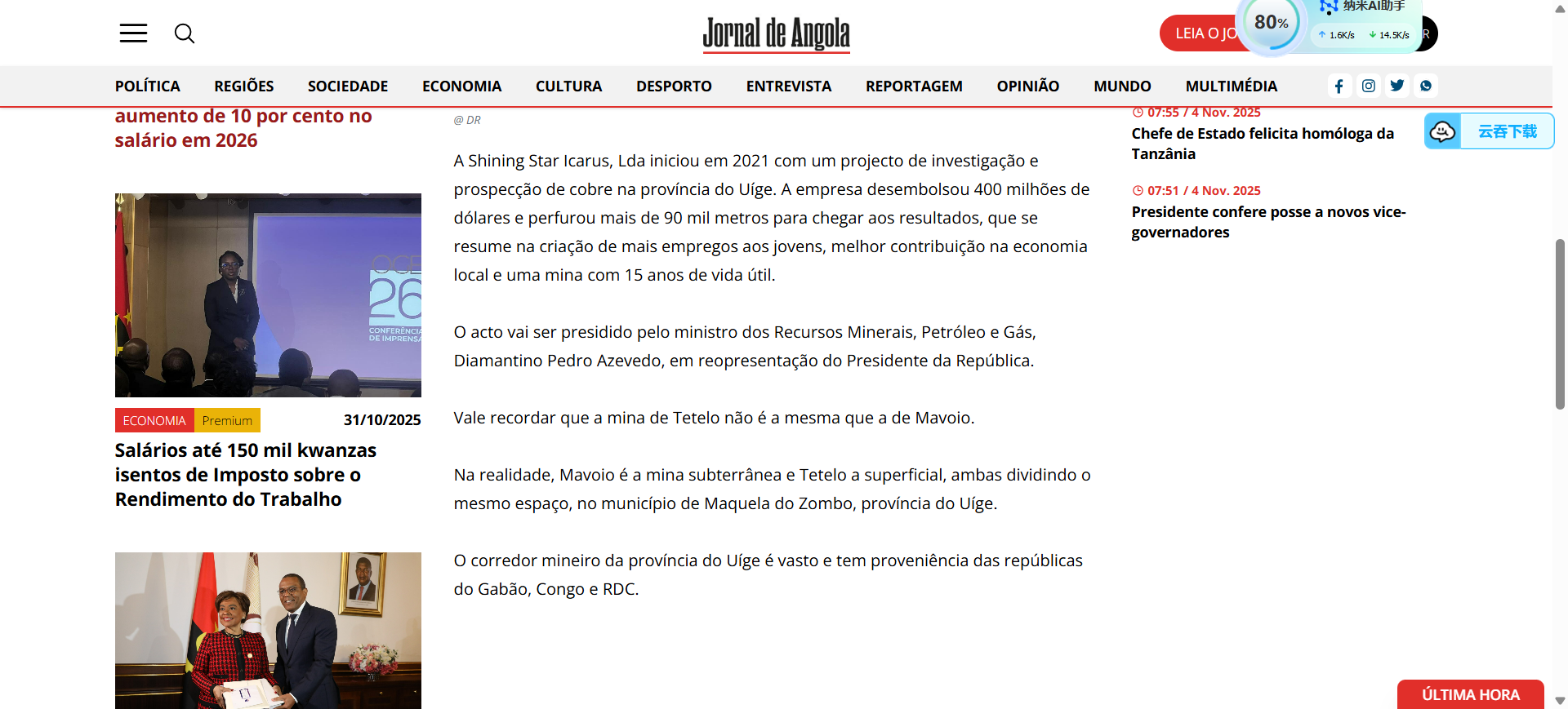 日前,由水(shui)电十(shi)四(si)局承(cheng)建的安哥拉(la)Tetelo铜矿投产(chan),铜矿露(lu)天开采工作正(zheng)式(shi)启(qi)动,安哥拉(la)主流(liu)媒(mei)体争相进行报道。 《安(an)(an)哥(ge)拉(la)(la)国家广播(bo)电台》《安(an)(an)哥(ge)拉(la)(la)日报》《安(an)(an)哥(ge)拉(la)(la)24小时报》等(deng)多家当地(di)主(zhu)流(liu)媒体纷纷从(cong)经(jing)济(ji)价值、社会贡献、合作意义等(deng)方面,多维度点(dian)赞这一里程碑(bei)事件。 安(an)(an)哥拉国家(jia)广(guang)播电台报道:“安(an)(an)哥拉矿(kuang)(kuang)业(ye)迎来历(li)史性(xing)(xing)时刻:Tetelo铜(tong)矿(kuang)(kuang)一期投产,时隔半世(shi)纪重启露天铜(tong)矿(kuang)(kuang)开(kai)采。今日对安(an)(an)哥拉矿(kuang)(kuang)业(ye)而言(yan)具(ju)有历(li)史性(xing)(xing)意义。时隔50年后(hou),安(an)(an)哥拉在威热省马(ma)克拉杜(du)宗博市马(ma)沃(wo)约地区正式启动(dong)Tetelo铜(tong)矿(kuang)(kuang)一期项目投产,重新开(kai)启露天铜(tong)矿(kuang)(kuang)开(kai)采事业(ye)。” 《安哥拉日报》报道(dao):“位(wei)于(yu)威(wei)热省马(ma)克(ke)拉杜宗博(bo)市的(de)Tetelo铜(tong)矿今日正(zheng)式投(tou)产,标志着该地(di)(di)区(qu)铜(tong)矿露天(tian)开采工作的(de)启动。项目成(cheng)果(guo)显著,为当地(di)(di)青年(nian)创造了更多就业岗位(wei),为地(di)(di)方经济(ji)发展(zhan)作出更大贡(gong)献。” 《安(an)哥拉(la)24h报(bao)》报(bao)道(dao):“安(an)哥拉(la)首座(zuo)地下铜矿‘Tetelo’投产(chan),中(zhong)安(an)合(he)作开(kai)启(qi)新纪元(yuan)。安(an)哥拉(la)矿产(chan)资源、石油与天然气部长今(jin)日称(cheng),位于威热(re)省的(de)(de)安(an)哥拉(la)首座(zuo)地下铜矿Tetelo投产(chan),是(shi)‘一项具(ju)有战略远见的(de)(de)举(ju)措’。” 多(duo)(duo)家主(zhu)流(liu)媒体在报道中(zhong)强调(diao),中(zhong)安(an)合作开启(qi)新纪元,Tetelo铜矿投产对安(an)哥拉(la)而(er)言具(ju)有(you)历史(shi)性意(yi)义,是巩固国民经济、实现收入来源多(duo)(duo)元化的(de)重要一步(bu),对安(an)哥拉(la)工(gong)业与技术发(fa)展(zhan)具(ju)有(you)重要象征意(yi)义。同时,Tetelo铜矿为(wei)当地创造多(duo)(duo)个就业岗位(wei)、为(wei)地方(fang)经济发(fa)展(zhan)作出(chu)更大贡献。安(an)哥拉(la)政府官员指出(chu)“这(zhei)意(yi)味(wei)着价值将(jiang)在本土创造,就业将(jiang)在本土提供,财富(fu)将(jiang)留存(cun)于安(an)哥拉(la)。” Tetelo铜矿的成功投产,是水电十(shi)四(si)局(ju)践(jian)行“一(yi)(yi)带一(yi)(yi)路”倡议(yi)、深化国际产能合(he)作的又一(yi)(yi)重要(yao)成果。水电十(shi)四(si)局(ju)将以卓越的工程(cheng)实(shi)力和(he)负责任(ren)的企(qi)业(ye)形象,不断开拓海外市场,在全(quan)球市场深化合(he)作,为推动高质量(liang)(liang)共建“一(yi)(yi)带一(yi)(yi)路”行稳致远贡献更多电建力量(liang)(liang)。 安哥拉广播电台 安哥拉日报 安哥拉24h报 安哥拉财经扩展报 |